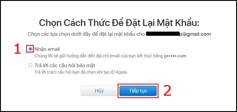 Bước 2: Nhập địa chỉ email mà bạn đã dùng để đăng ký tài khoản iCloud và chọn “Tiếp tục”. Một mail mới từ Apple được gửi tới bạn.