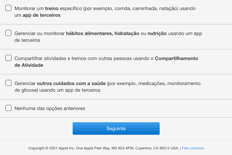 Sau những câu hỏi này, Apple cũng hỏi về các ứng dụng của bên thứ ba để quản lý dữ liệu sức khỏe. Cuộc khảo sát cung cấp các tùy chọn về việc sử dụng các ứng dụng của bên thứ ba để theo dõi việc tập luyện, theo dõi thói quen ăn uống (bao gồm cả hydrat hóa và dinh dưỡng) và quản lý các dịch vụ chăm sóc sức khỏe khác (chẳng hạn như thuốc và theo dõi mức đường huyết).
