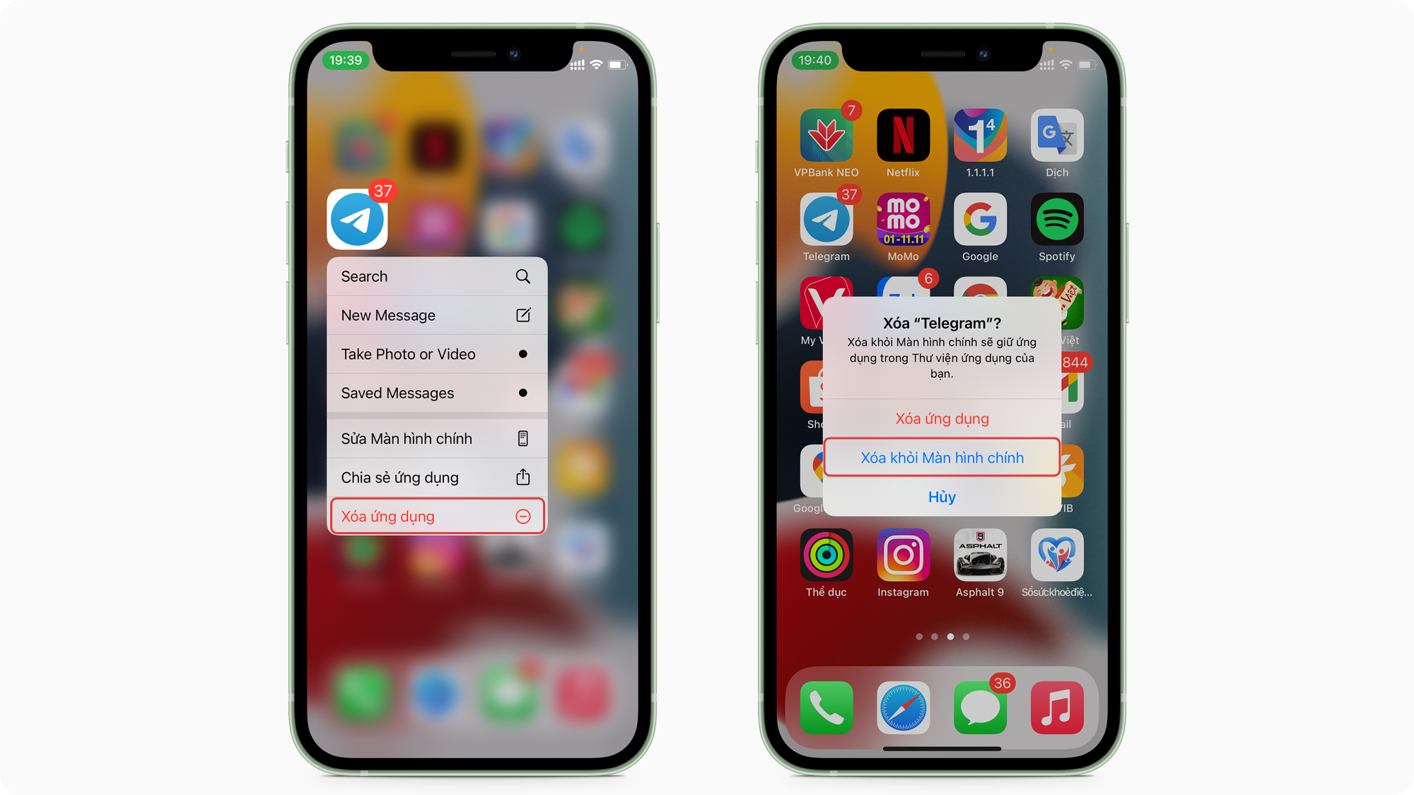 Nhấn giữ vào app muốn ẩn, chọn Remove app > Remove from Home Screen tức thì app sẽ biến mất khỏi màn hình Home.