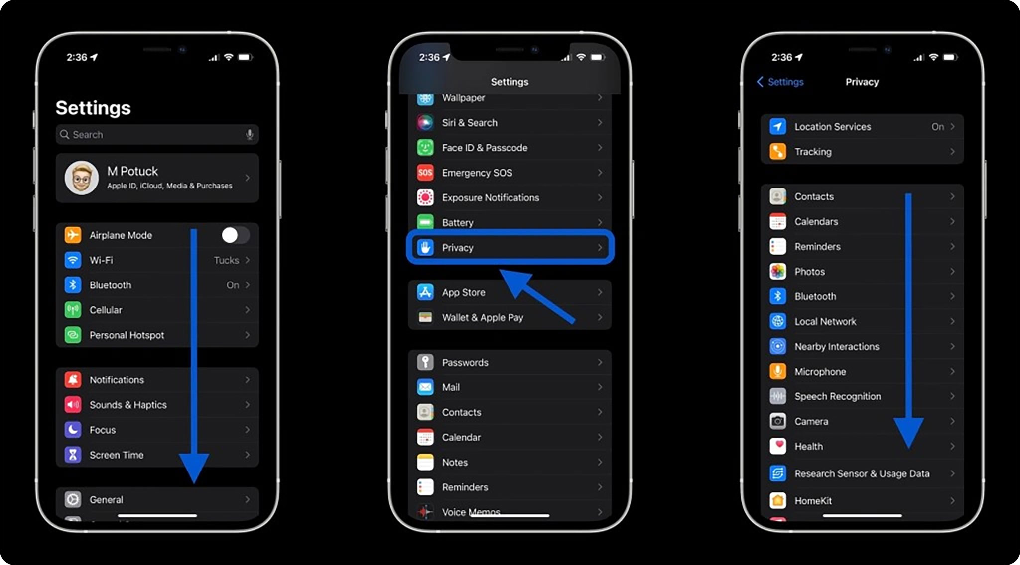 - Vuốt xuống và chọn “Quyền riêng tư”