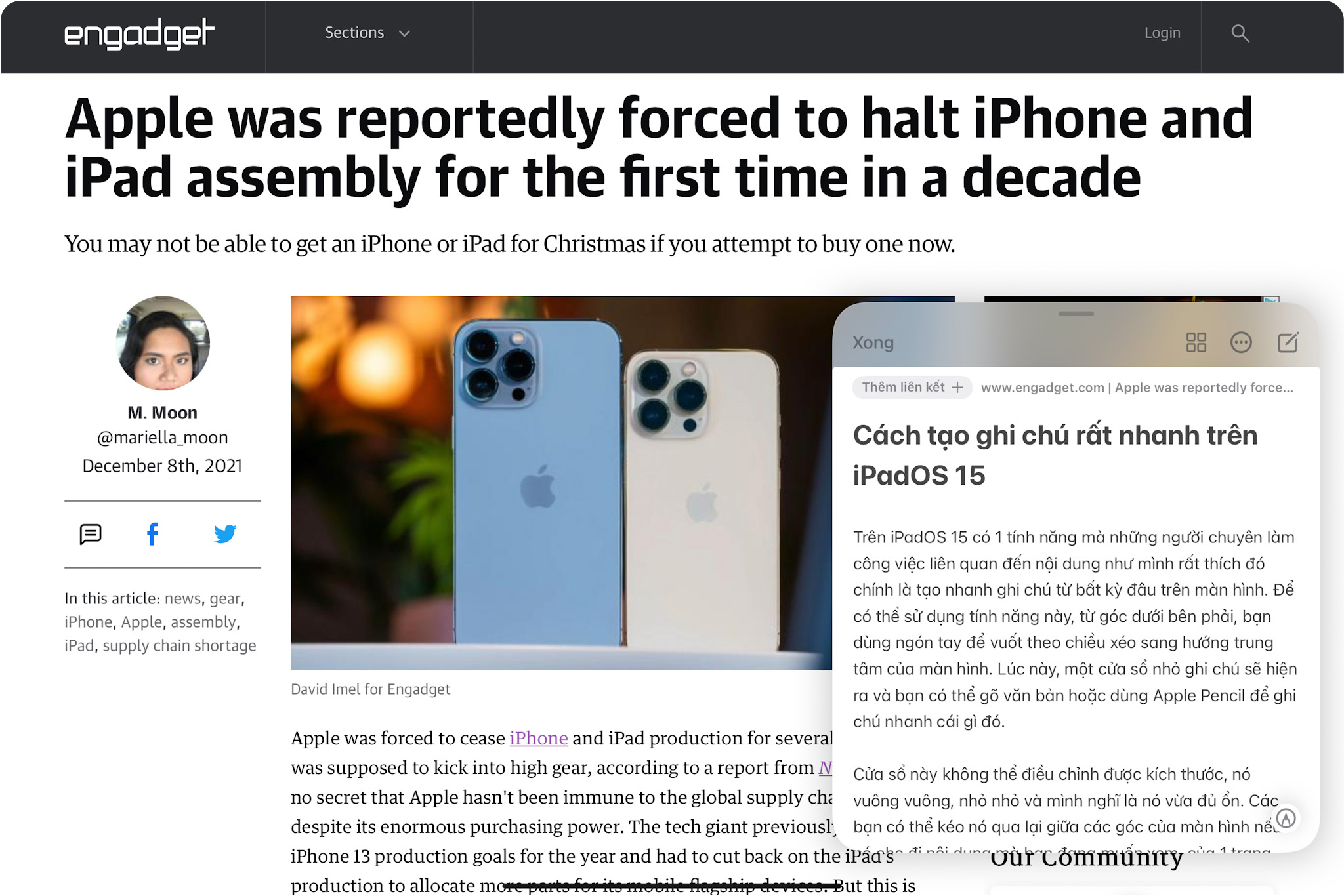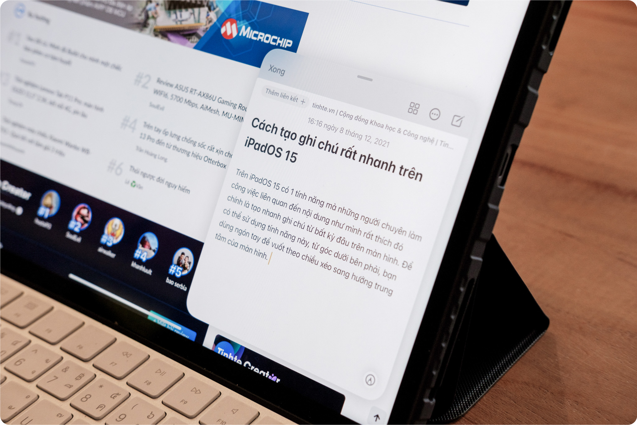 Trên iPadOS 15 có 1 tính năng mà những người chuyên làm công việc liên quan đến nội dung như mình rất thích đó chính là tạo nhanh ghi chú từ bất kỳ đâu trên màn hình. Để có thể sử dụng tính năng này, từ góc dưới bên phải, bạn dùng ngón tay để vuốt theo chiều xéo sang hướng trung tâm của màn hình. Lúc này, một cửa sổ nhỏ ghi chú sẽ hiện ra và bạn có thể gõ văn bản hoặc dùng Apple Pencil để ghi chú nhanh cái gì đó.