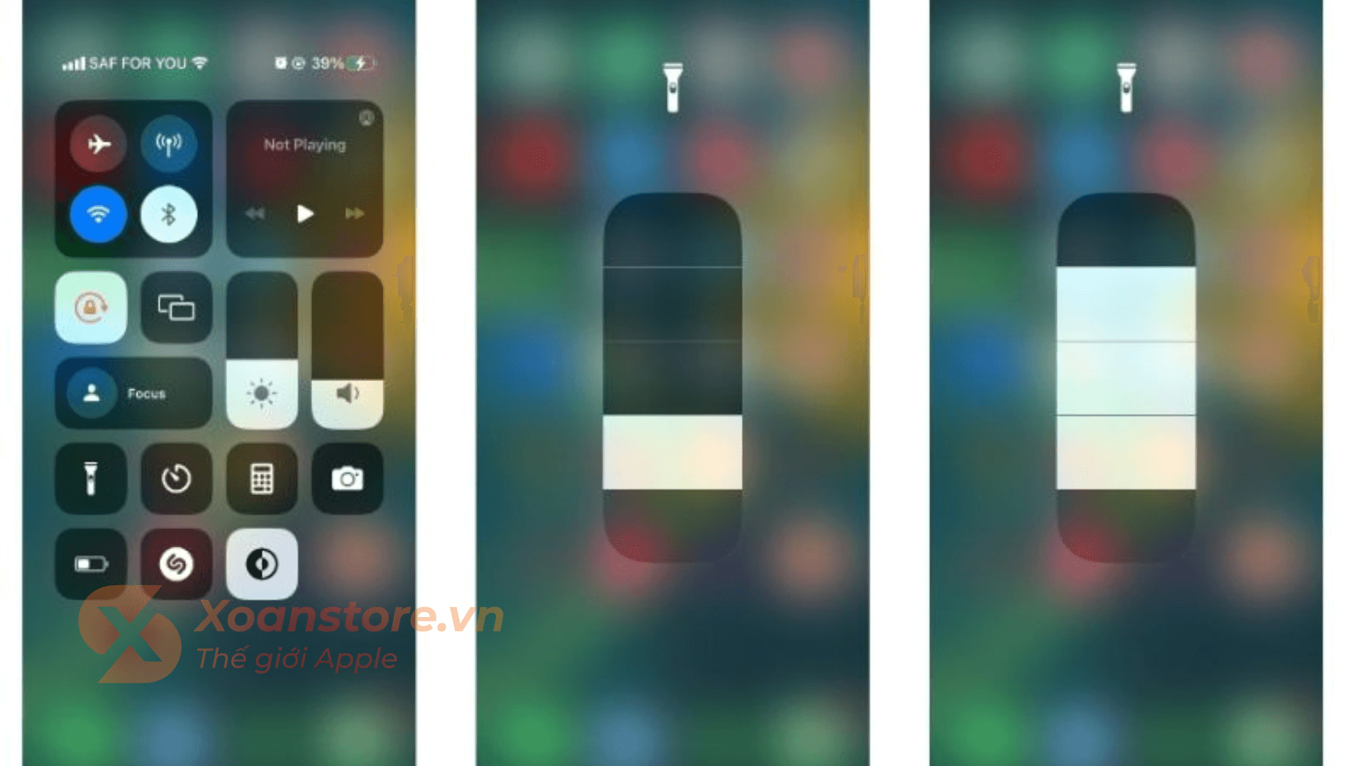 Bạn hãy nhấn và giữ biểu tượng Đèn flash tại Trung tâm điều khiển và chọn mức độ sáng mong muốn của mình.
