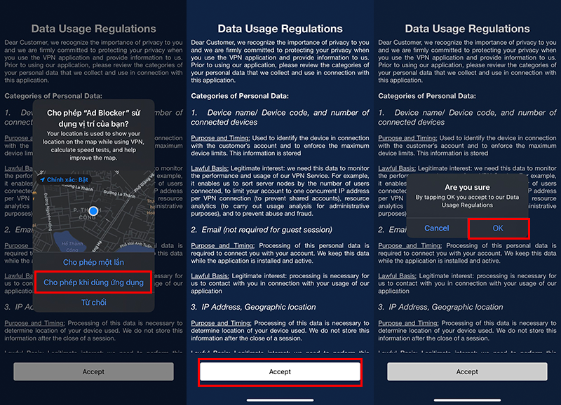 Bước 2: Sau khi quá trình tải về hoàn tất, hãy thoát về màn hình chính và nhấp chọn vào biểu tượng của ứng dụng. Tại đây, bạn sẽ cần cấp quyền sử dụng vị trí cho ứng dụng. Kế đến bạn cần chấp nhận (Accept) các điều khoản trong Quy trình sử dụng dữ liệu (Data Usage Regulations) để bắt đầu sử dụng.