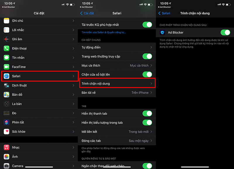 Bước 4: Kế đến, ứng dụng sẽ điều hướng bạn đến Safari trong Cài đặt (Settings). Tại đây, bạn hãy kéo xuống mục Cài đặt chung > chọn tab Trình chặn nội dung. Cuối cùng kéo bật thanh gạt sang khung màu xanh để kích hoạt AdBlocker! Thật đơn giản phải không nào?
