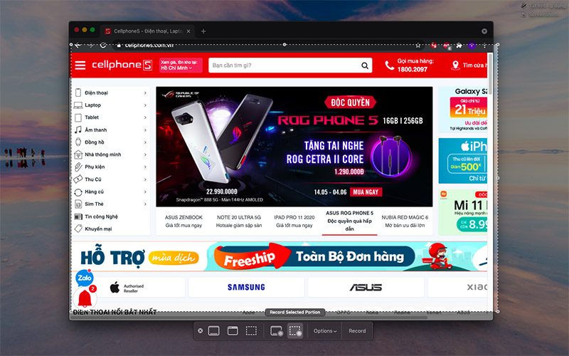 - Record Selected Portion – Bạn chỉ có thể quay với 1 khu vực chọn trước. Để chọn khu vực mình muốn, bạn chỉ bấm và kéo thả chuột vào chỉ khu vực đó.