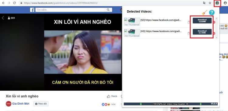 Bước 4: Chọn vào biểu tượng FBDown Video ở góc phải, phần mềm sẽ hiển thị các định dạng video bạn có thể tải, chọn và nhấp vào định dạng video mà bạn muốn tải.