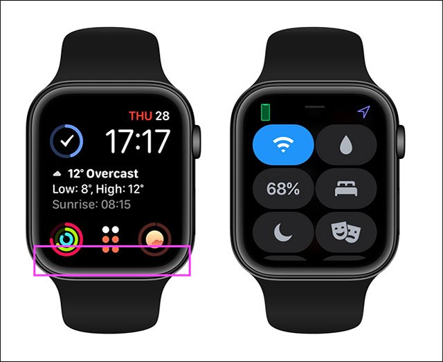 Để xem Apple Watch của bạn có được kết nối với iPhone không, hãy chạm và giữ cạnh dưới của màn hình đồng hồ, vuốt lên để mở Trung tâm kiểm soát, sau đó tìm biểu tượng trạng thái Đã kết nối.