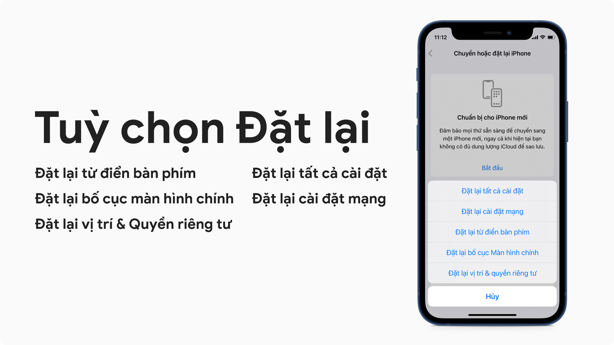 Ngoài xóa iPhone, trong phần Đặt lại của máy bạn cũng có thể lựa chọn một trong các cách cài đặt máy như: