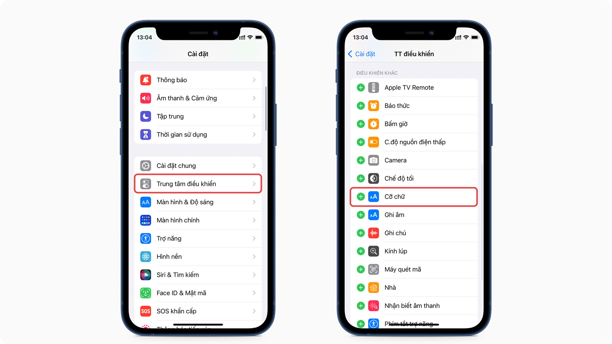 Để làm điều đó bạn vào Cài đặt - chọn Trung tâm điều khiển (Control Center) và thêm phần kích cỡ chữ (Text Size) vào.