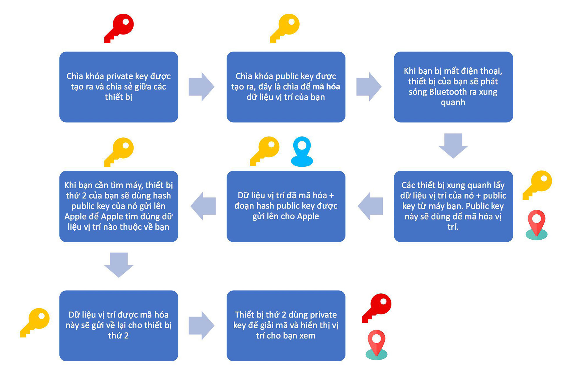 Apple nói rằng dữ liệu gửi đi hoàn toàn nặc danh và được mã hóa từ đầu đến cuối. Điều thú vị là bạn cần phải sở hữu 2 máy Apple trở lên mới dùng được chế độ mới của Find My do máy còn lại của bạn sẽ là nơi chứa chìa khóa (private key) để giải mã các gói tin (ngoài ra còn có một chìa khác gọi là public key cũng được tạo ra). Private key của bạn sẽ được chia sẻ giữa các thiết bị do bạn sở hữu một cách an toàn để lỡ mất máy này thì máy kia vẫn còn.