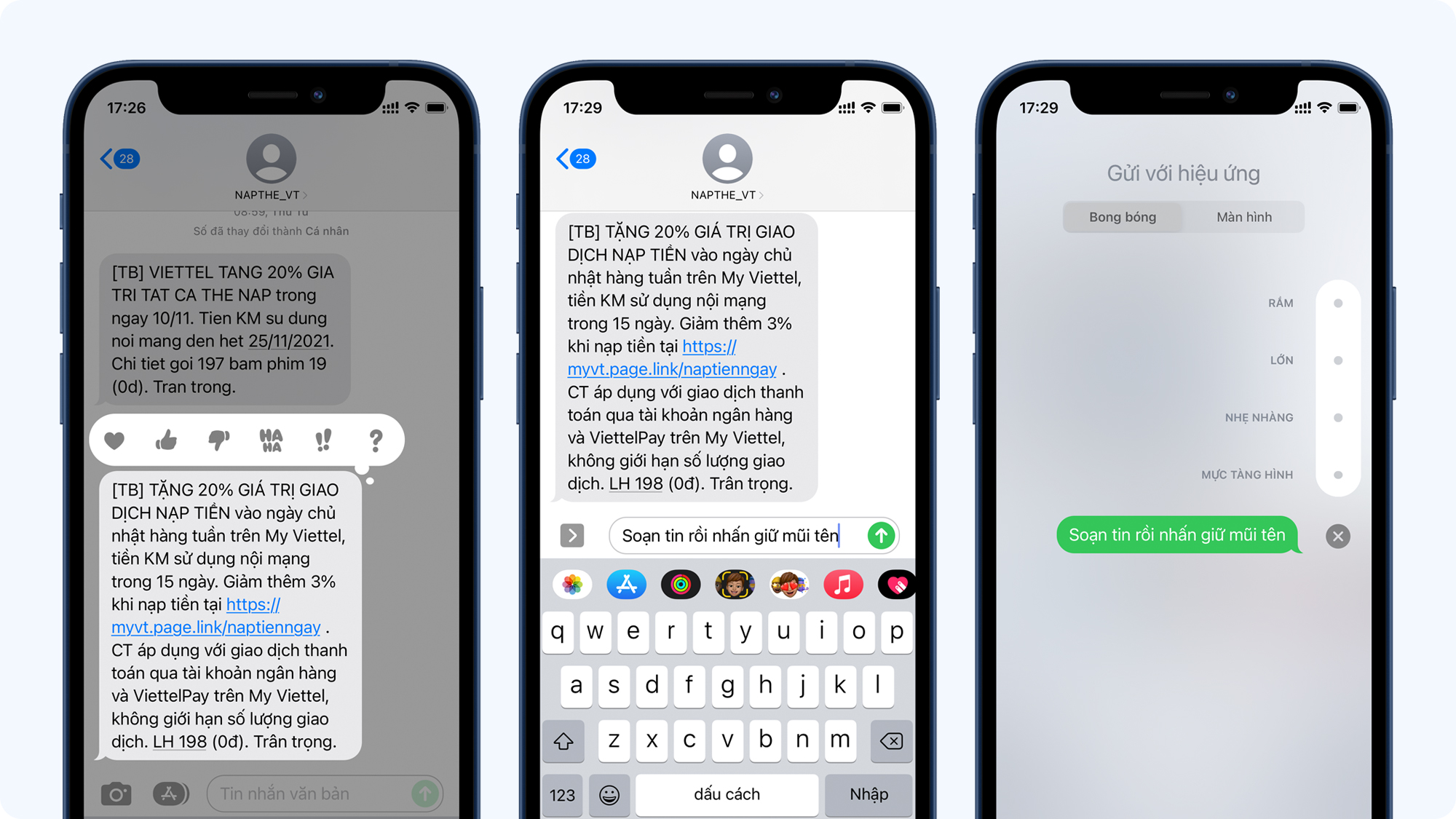 Ngoài ra còn có nhiều hiệu ứng gửi tin nhắn hay ho như rầm, lớn, nhẹ nhàng, mực tàng hình. Để làm được điều này thì sau khi soạn tin nhắn xong bạn nhấn giữ phím mũi tên và chọn hiệu ứng gửi mà mình thích.