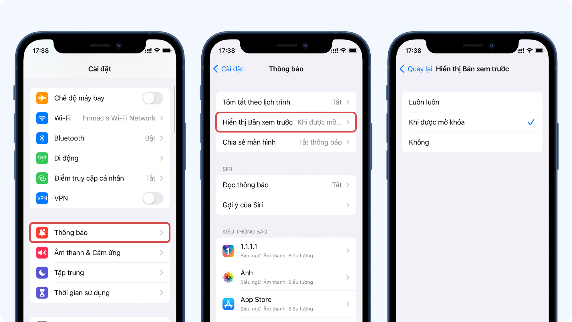 Vào Cài đặt > Chọn Thông báo > Chọn Hiển thị bản xem trước > Chọn Khi được mở khóa.