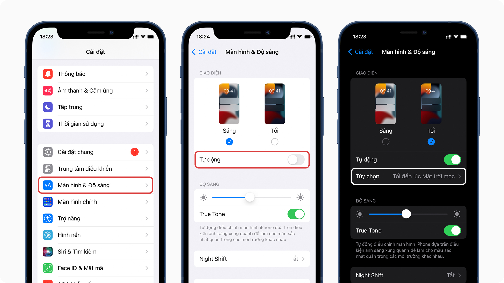 Bạn sẽ thấy trong một số game khung cảnh sẽ thay đổi đúng theo thời gian thực bên ngoài. Và chiếc iPhone cũng có thể làm được điều đó với chế độ Dark mode. Để thử chế độ này, bạn vào phần Cài đặt, chọn Màn hình và độ sáng, sau đó bật gạt tự động. Chiếc iPhone sẽ tự động bật sáng/tối theo thời gian thực bên ngoài. Ngoài ra bạn cũng có thể cài đặt cố định thời gian. Bạn chọn vào phần Tùy chọn bên dưới và điều chỉnh theo ý mình.