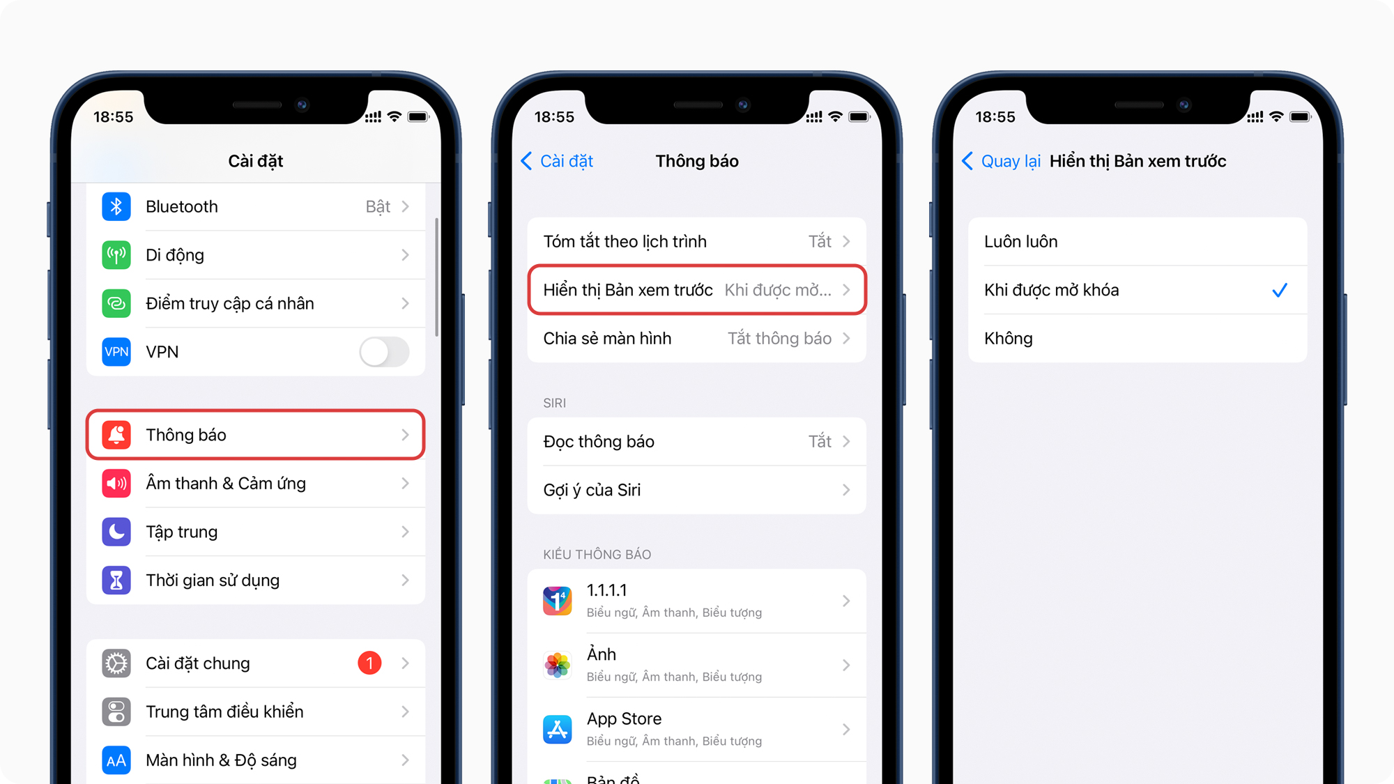 iPhone là chiếc điện thoại có tính năng bảo mật cao nhất, an toàn nhất. Mặc dù vậy, đôi khi những tin nhắn từ ứng dụng Messenger hay Zalo,… vẫn sẽ hiển thị lên màn hình. Và nếu bạn không muốn người khác vô tình đọc được, hãy sử dụng tính năng này. Bạn vào phần Cài đặt, chọn mục Thông báo rồi tìm phần Hiển thị bản xem trước. Sau đó bạn chỉ cần tắt hiện thông báo thì nội dung sẽ được bảo mật khi đang khóa màn hình.