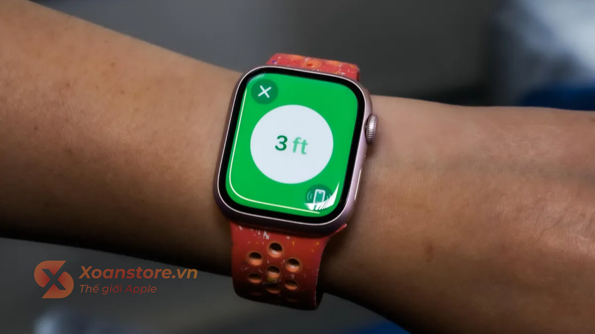 Một trong những tính năng được người dùng đánh giá cao trên Apple Watch Series 9 đó là tính năng Tìm kiếm chính xác iPhone. Sản phẩm được tích hợp công nghệ Ultra Wideband và sẽ hướng dẫn bạn đến vị trí iPhone thông qua khoảng cách gần đúng và hướng đi cụ thể. Điều này giúp người dùng chẳng may khi thất lạc iPhone thì có thể tìm ra chiếc điện thoại của mình một cách dễ dàng bằng Apple Watch Series 9.