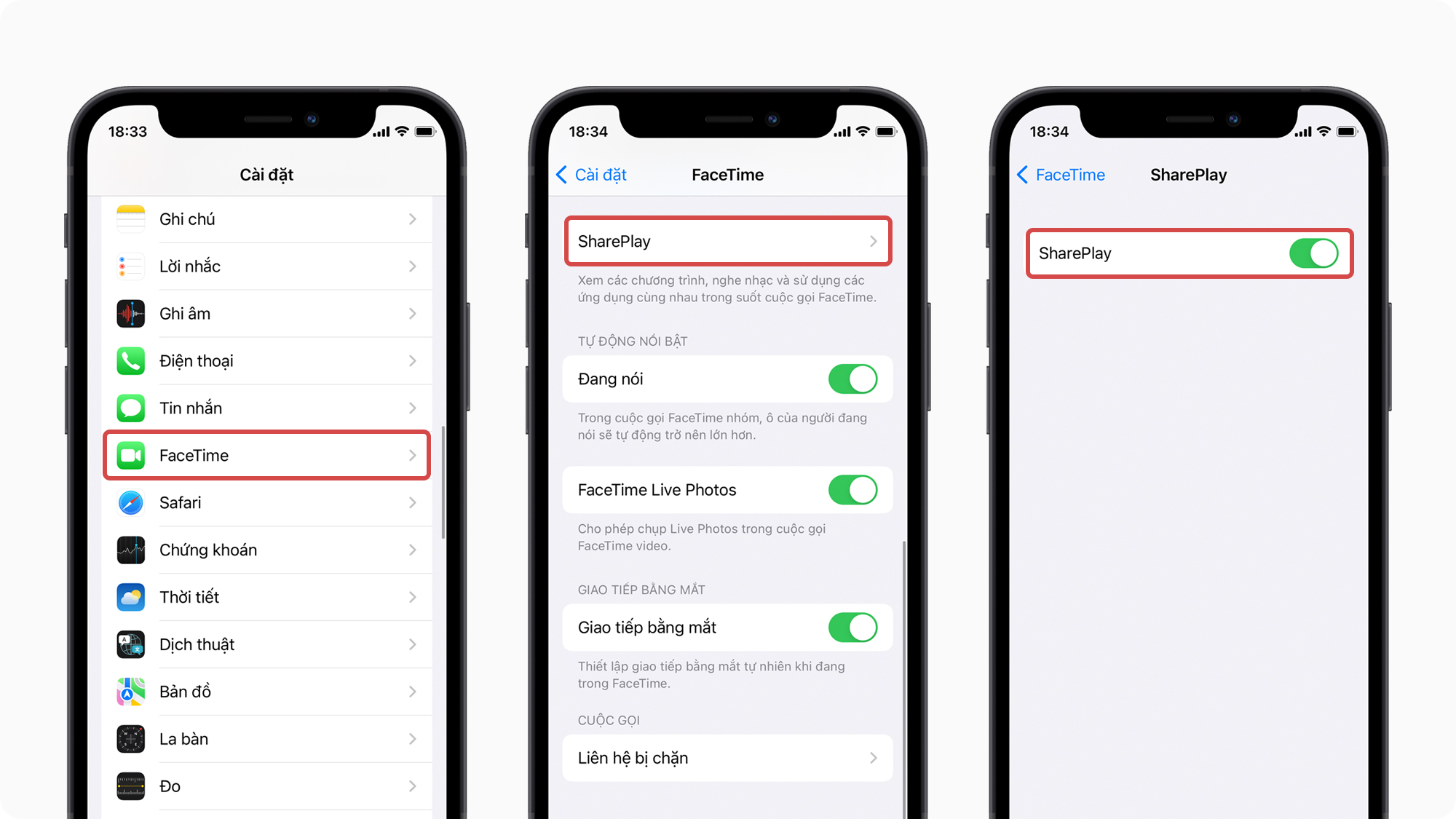 Các bạn vào Cài đặt - FaceTime - SharePlay sau đó bật lên