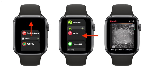 Khi bạn nhấn nút sườn, màn hình sẽ hiển thị danh sách các ứng dụng được sử dụng gần đây với ứng dụng gần nhất ở trên cùng. Tại đây, bạn có thể cuộn xuống bằng tay hoặc dùng nút Digital Crown để xem các ứng dụng khác.