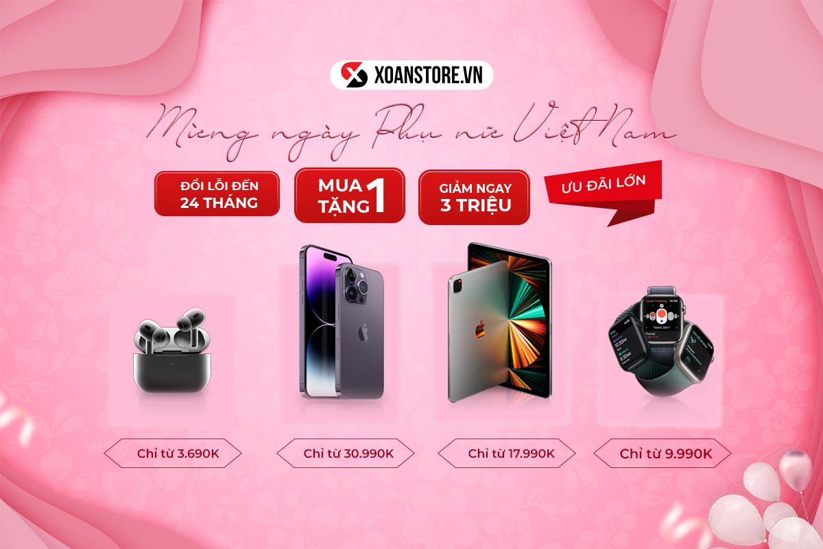 Nhân ngày Phụ nữ Việt Nam 20/10, Xoăn Store sẽ mang đến cho quý khách những ưu đãi hấp dẫn với rất nhiều các sản phẩm được giảm giá sâu. Đặc biệt, để tôn vinh và gửi lời yêu thương đến một nửa ngọt ngào của thế giới, hàng loạt siêu phẩm iPhone, AirPods, iPad, Apple Watch và phụ kiện công nghệ đang có khuyến mãi cực sốc, giảm giá lên đến 3 triệu đồng.